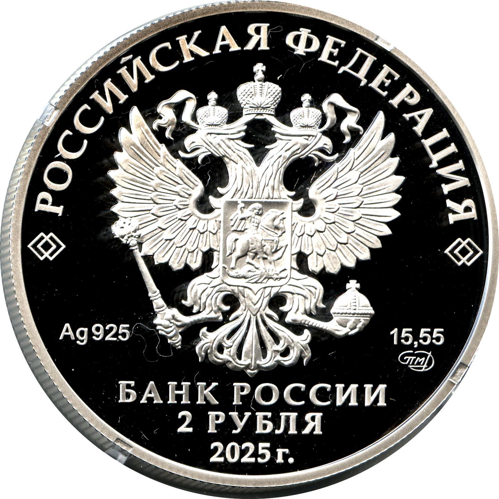Опис: Рельєфне зображення Державного герба Російської Федерації та напівкругла напис над ним уздовж краю: «РОССИЙСКАЯ ФЕДЕРАЦИЯ» (РОСІЙСЬКА ФЕДЕРАЦІЯ), обрамлена парними ромбами з обох боків, під гербом зліва розміщений хімічний символ металу та проба, а праворуч — вміст дорогоцінного металу та торгова марка монетного двору, внизу по центру трьома рядками розміщений напис: «БАНК РОССИИ» (БАНК РОСІЇ), номінал монети: «2 РУБЛЯ» (2 РУБЛІ) та рік випуску: «2025 г.» (2025).