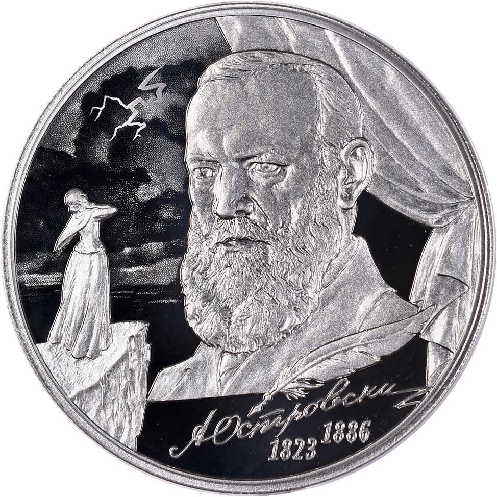 Опис: На звороті монети зображено рельєфний портрет Олександра Островського на тлі піднятої великої драпіровки; зображення сцени з п'єси «Буря», вилито рельєфом і оброблено лазером для матового покриття, зліва; а також рельєфне зображення пера, факсиміле підпису драматурга та роки його народження і смерті «1823» і «1886» нижче.