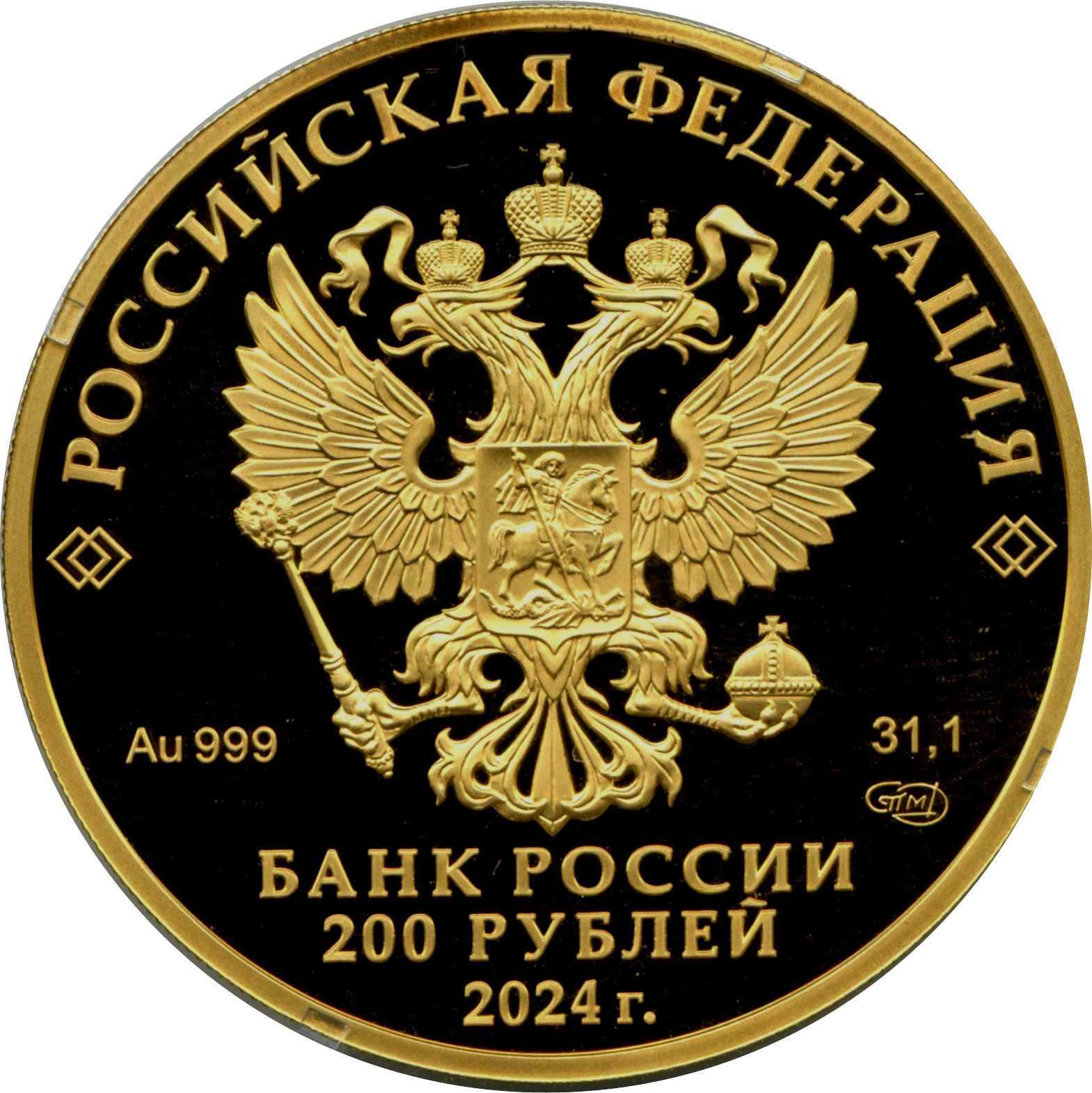 Опис: На дзеркальному полі диска зображено рельєфний герб Російської Федерації, над ним по колу розміщено напівкруглий напис «РОССИЙСКАЯ ФЕДЕРАЦИЯ» (РОСІЙСЬКА ФЕДЕРАЦІЯ), обрамлене з обох боків подвійними ромбами, нижче під гербом зліва вказано дорогоцінний метал і його пробу, а праворуч — вміст дорогоцінного металу і знак монетного двору, внизу по центру трьома рядками розміщено напис «БАНК РОССИИ» (БАНК РОСІЇ), номінал монети «200 РУБЛЕЙ» (200 РУБЛІВ) і рік «2024 г.» (2024).
