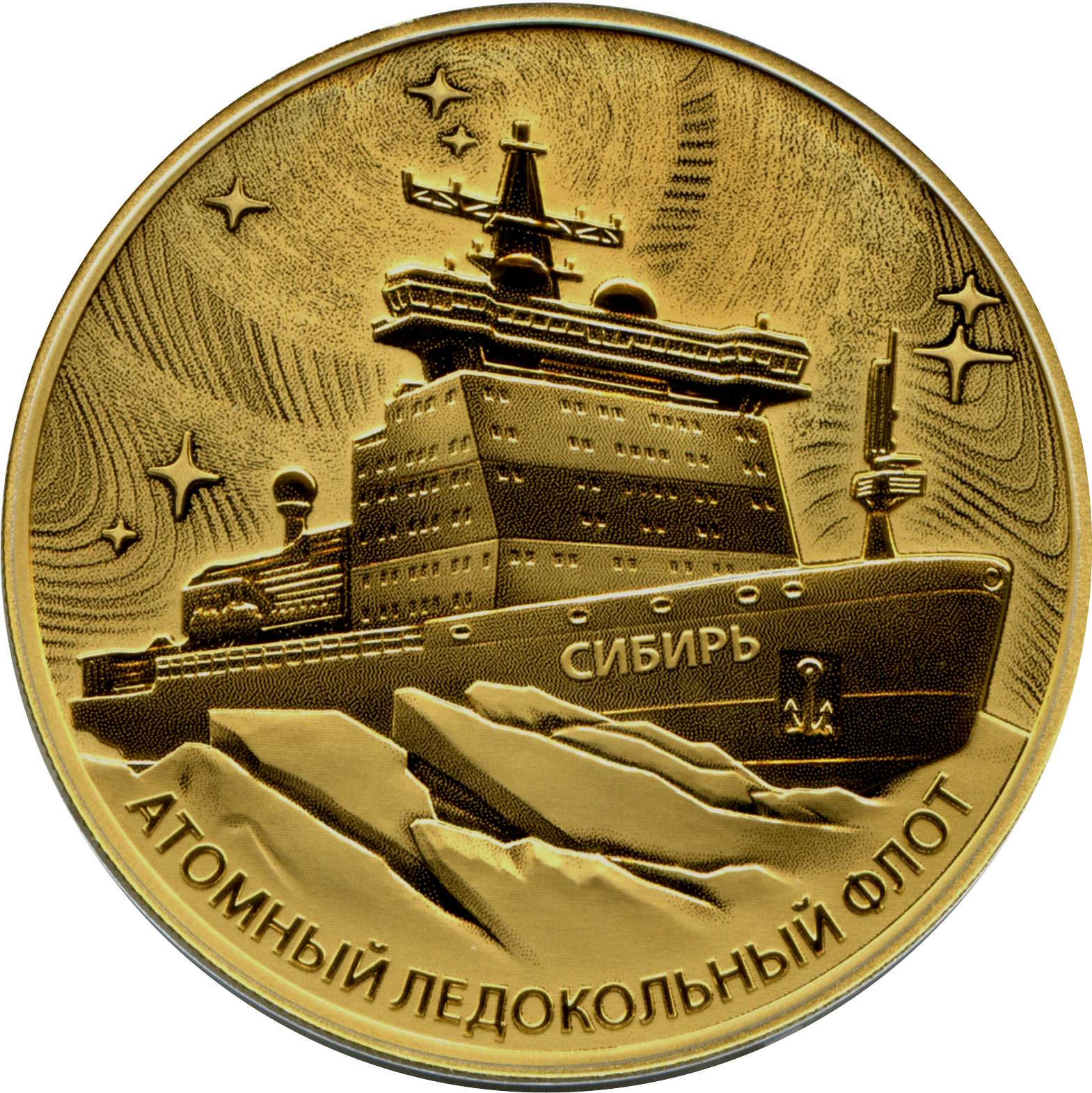 Опис: На дзеркальній поверхні диска зображено рельєфне зображення атомного криголама «Сибір» та крижаних гребенів на тлі стилізованого зображення зоряного неба, обробленого лазером для матового покриття з рельєфними ділянками, а також напис «АТОМНЫЙ ЛЕДОКОЛЬНЫЙ ФЛОТ» (АТОМНИЙ ЛЕДОКОЛЬНЫЙ ФЛОТ) внизу, по колу.