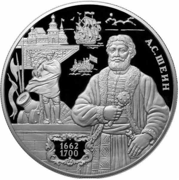 Опис: На дзеркальному полі диска праворуч — рельєфний портрет А.С. Шейна в старовинному російському одязі, який тримає в руці булаву, ліворуч від нього на фрагменті кам'яної стіни — картуш з датами у двох рядках: «1662» і «1700», за стіною — колажові зображення військових перемог і реформ: солдат у європейському одязі, мортира, спис із стрічкою-маркою, сокира, прапор Другої Азовської кампанії, на задньому плані — вежа фортеці, у центрі — буксирний човен і вітрильне судно на гладкій поверхні моря, праворуч уздовж краю — напис: «А.С. ШЕИН» (А.С. ШЕЙН).