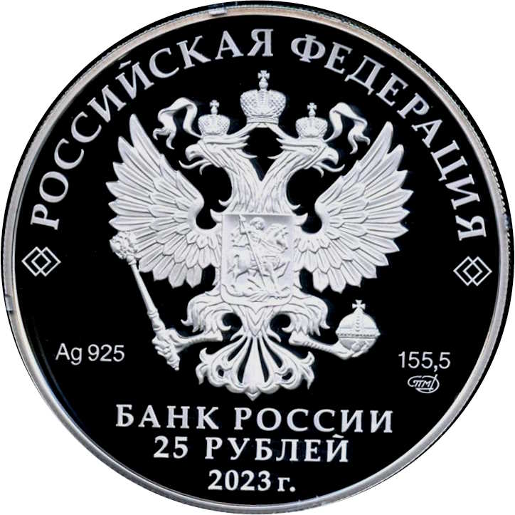 Опис: На аверсі монети зображено рельєфний герб Російської Федерації та написи «РОССИЙСКАЯ ФЕДЕРАЦИЯ» (РОСІЙСЬКА ФЕДЕРАЦІЯ) і «БАНК РОССИИ» (БАНК РОСІЇ), номінал монети «25 РУБЛЕЙ» (25 РУБЛІВ), рік випуску «2023 г.» (2023), хімічний символ металу, проба, товарний знак Санкт-Петербурзького монетного двору та вміст дорогоцінного металу.
