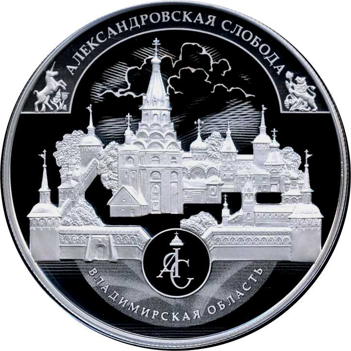 Опис: На зворотному боці монети зображено рельєфні зображення архітектурного комплексу Олександрівська Слобода на тлі стилізованого зображення неба та квіткового орнаменту, обидва оброблені лазером для матового покриття, а також емблема музею-заповідника в круглій рамці; та рельєфні написи «АЛЕКСАНДРОВСКАЯ СЛОБОДА» (АЛЕКСАНДРОВСКАЯ СЛОБОДА) по верхньому колу в матовій частині, з рельєфними геральдичними зображеннями єдинорога та лева по краях, а також «ВЛАДИМИРСКАЯ ОБЛАСТЬ» (ВЛАДИМИРСКАЯ ОБЛАСТЬ) по нижньому колу на матовому тлі.