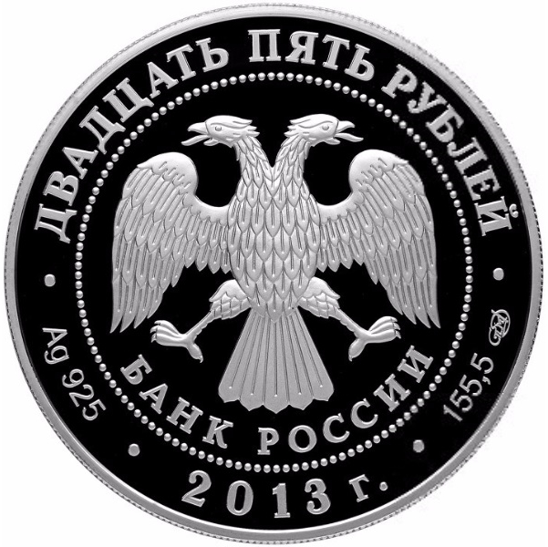 Опис: У центрі — емблема Банку Росії [двоголовий орел із опущеними крилами, під ним — напівкруглий напис «БАНК РОССИИ» (БАНК РОСІЇ)], обрамлена колом з крапок і написів по краю — зверху: «ДВАДЦАТЬ ПЯТЬ РУБЛЕЙ» (ДВАДЦЯТЬ П'ЯТЬ РУБЛІВ), знизу: ліворуч – позначення дорогоцінного металу та його проби, у центрі – рік випуску «2013 г.» (2013), праворуч – вміст дорогоцінного металу та знак монетного двору.