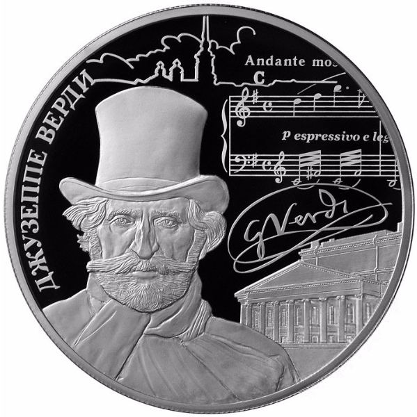 Опис: На дзеркальному полі диска ліворуч внизу — рельєфний фрагмент портрета Джузеппе Верді роботи Джованні Болдіні, на тлі праворуч — Великий Кам'яний театр у Санкт-Петербурзі, над ним – факсимільний підпис композитора, праворуч вгорі – фрагмент партитури, ліворуч – контури Петропавлівської фортеці, ліворуч по краю – напівкруглий напис: «ДЖУЗЕППЕ ВЕРДІ» (ДЖУЗЕППЕ ВЕРДІ).