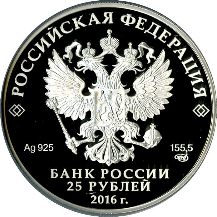 Опис: Рельєфне зображення державного герба Російської Федерації. Є написи: «РОССИЙСКАЯ ФЕДЕРАЦИЯ» (РОСІЙСЬКА ФЕДЕРАЦІЯ), «БАНК РОССИИ» (БАНК РОСІЇ), номінал монети — «25 РУБЛЕЙ» (25 РУБЛІВ) і рік — «2016», позначення металу відповідно до періодичної системи елементів Д. І. Менделєєва, проба, торгова марка монетного двору Санкт-Петербурга та вміст дорогоцінного металу.