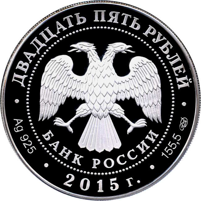 Опис: У центрі — емблема Банку Росії [двоголовий орел із опущеними крилами, під ним — напівкруглий напис «БАНК РОССИИ» (БАНК РОСІЇ)], обрамлена колом з крапок і написів по краю — зверху: «ДВАДЦАТЬ ПЯТЬ РУБЛЕЙ» (ДВАДЦЯТЬ П'ЯТЬ РУБЛІВ), знизу: ліворуч – позначення дорогоцінного металу та його проби, у центрі – рік випуску «2015 г.» (2015), праворуч – вміст дорогоцінного металу та знак монетного двору.
