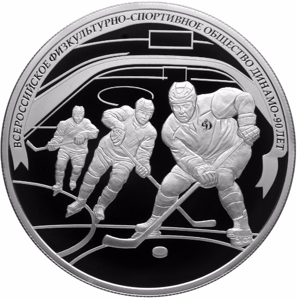 Опис: На дзеркальному полі диска на тлі контурів хокейної арени — рельєфне зображення трьох хокеїстів з шайбою в епізоді гри, зверху на світловій смузі вздовж обідка — напис: «ВСЕРОССИЙСКОЕ ФИЗКУЛЬТУРНО-СПОРТИВНОЕ ОБЩЕСТВО ДИНАМО-90 ЛЕТ» (ВСЕРОСІЙСЬКЕ СПОРТИВНЕ ТОВАРИСТВО «ДИНАМО» — 90 РОКІВ).