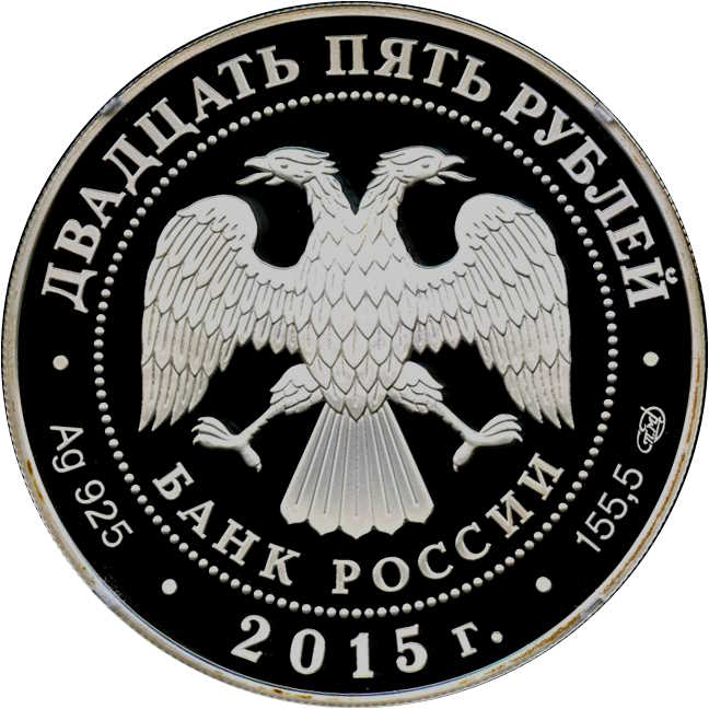 Опис: У центрі — емблема Банку Росії [двоголовий орел із опущеними крилами, під ним — напівкруглий напис «БАНК РОССИИ» (БАНК РОСІЇ)], обрамлена колом з крапок і написів по краю — зверху: «ДВАДЦАТЬ ПЯТЬ РУБЛЕЙ» (ДВАДЦЯТЬ П'ЯТЬ РУБЛІВ), знизу: ліворуч – позначення дорогоцінного металу та його проби, у центрі – рік випуску «2015 г.» (2015), праворуч – вміст дорогоцінного металу та знак монетного двору.