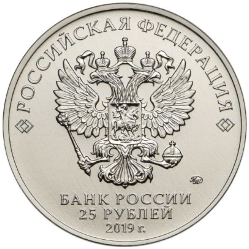 Опис: На аверсі монет зображено рельєфний герб Російської Федерації, над ним по верхньому колу напис «РОССИЙСКАЯ ФЕДЕРАЦИЯ» (РОСІЙСЬКА ФЕДЕРАЦІЯ), обрамлений з обох боків парними ромбами, праворуч — знак Московського монетного двору, а в центрі монет під гербом — трирядковий напис «БАНК РОССИИ» (БАНК РОСІЇ), номінал монети «25 РУБЛЕЙ» (25 РУБЛІВ), рік випуску «2019 г.» (2019).