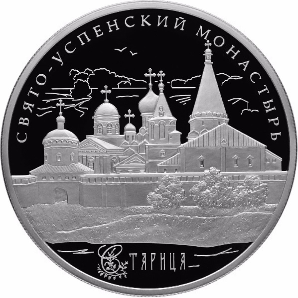 Опис: На дзеркальному полі диска – рельєфне зображення церков і дзвіниці монастиря за фрагментом кам'яної стіни, під ним – горизонтальний напис: «СТАРИЦА», зверху по краю – напівкруглий напис: «СВЯТО-УСПЕНСКИЙ МОНАСТЫРЬ».