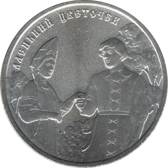 Опис: На реверсі монети зображено рельєфне зображення сцени з мультфільму «Аленкий цветочек» та рельєфний напис у верхній частині «АЛЕНЬКИЙ ЦВЕТОЧЕК» (THE SCARLET FLOWER) зліва по колу;