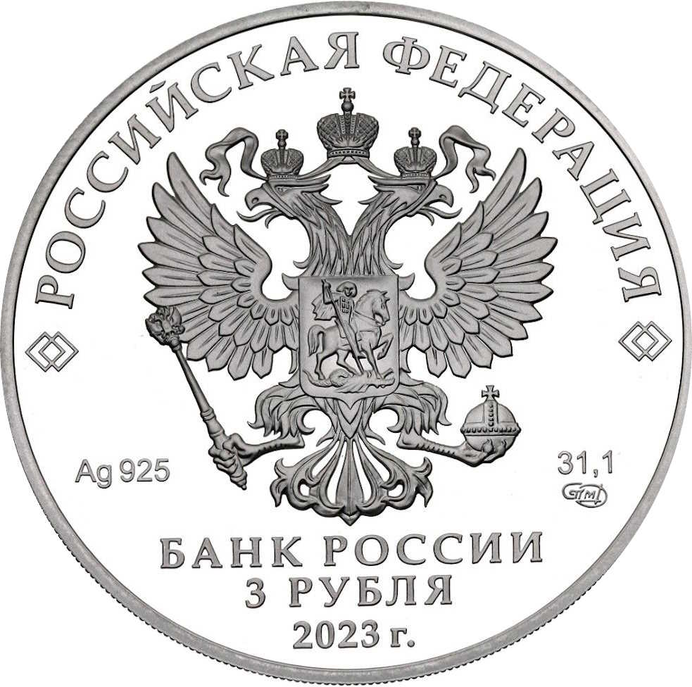 Опис: На аверсі монети зображено рельєфний герб Російської Федерації та написи «РОССИЙСКАЯ ФЕДЕРАЦИЯ» (РОСІЙСЬКА ФЕДЕРАЦІЯ) і «БАНК РОССИИ» (БАНК РОСІЇ), номінал монети «3 РУБЛЯ» (3 РУБЛЯ), рік випуску «2023 г.» (2023), хімічний символ металу за періодичною таблицею Менделєєва, проба, знак Санкт-Петербурзького монетного двору та вміст дорогоцінного металу.