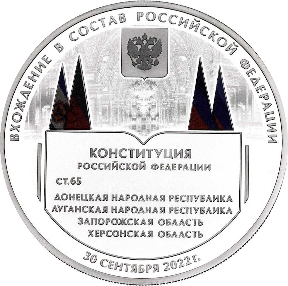 Опис: На реверсі монети зображено стилізоване зображення Конституції Російської Федерації, відкритої на сторінці статті 65, на тлі зображень центральної частини Залу Святого Георгія у Великому Кремлівському палаці, Державного герба Російської Федерації та прапорів Донецької Народної Республіки, Луганської Народної Республіки, Запорізької області та Херсонської області. Зображення Конституції та Залу оброблені лазером для матового покриття, зображення Державного герба та текст Конституції виконані рельєфно, а зображення прапорів – кольорові. По колу розміщені рельєфні написи: «ВХОЖДЕНИЕ В СОСТАВ РОССИЙСКОЙ ФЕДЕРАЦИИ» (ВСТУП ДО СКЛАДУ РОСІЙСЬКОЇ ФЕДЕРАЦІЇ) у верхній частині та «30 СЕНТЯБРЯ 2022 г.» (30 ВЕРЕСНЯ 2022 р.) у нижній частині.