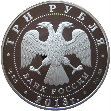 Опис: У центрі — емблема Банку Росії [двоголовий орел із розпростертими крилами, під ним — напівкруглий напис «БАНК РОССИИ» (БАНК РОСІЇ)], обрамлена колом з крапок і написів по краю — зверху: «ТРИ РУБЛЯ», нижче: ліворуч - позначення дорогоцінного металу та його проби, в центрі - рік випуску, праворуч - вміст дорогоцінного металу та знак монетного двору.