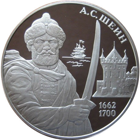 Опис: На дзеркальному полі диска ліворуч — рельєфний портрет А.С. Шейна з шаблею в руці, праворуч по краю — рельєфне зображення фортеці, праворуч зверху — напис по краю: «А.С. ШЕИН» (А.С. ШЕЙН), знизу — дати: «1662» і «1700», на тлі — вітрильне судно на гладкій поверхні моря.