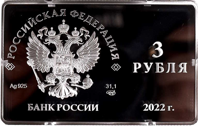 Опис: На аверсі монети зображено рельєфний герб Російської Федерації та написи «РОССИЙСКАЯ ФЕДЕРАЦИЯ» (РОСІЙСЬКА ФЕДЕРАЦІЯ) і «БАНК РОССИИ» (БАНК РОСІЇ), номінал монети «3 РУБЛЯ» (3 РУБЛЯ), рік випуску «2022 г.» (2022), хімічний символ металу відповідно до періодичної таблиці Менделєєва, проба, товарний знак Санкт-Петербурзького монетного двору та вміст дорогоцінного металу.