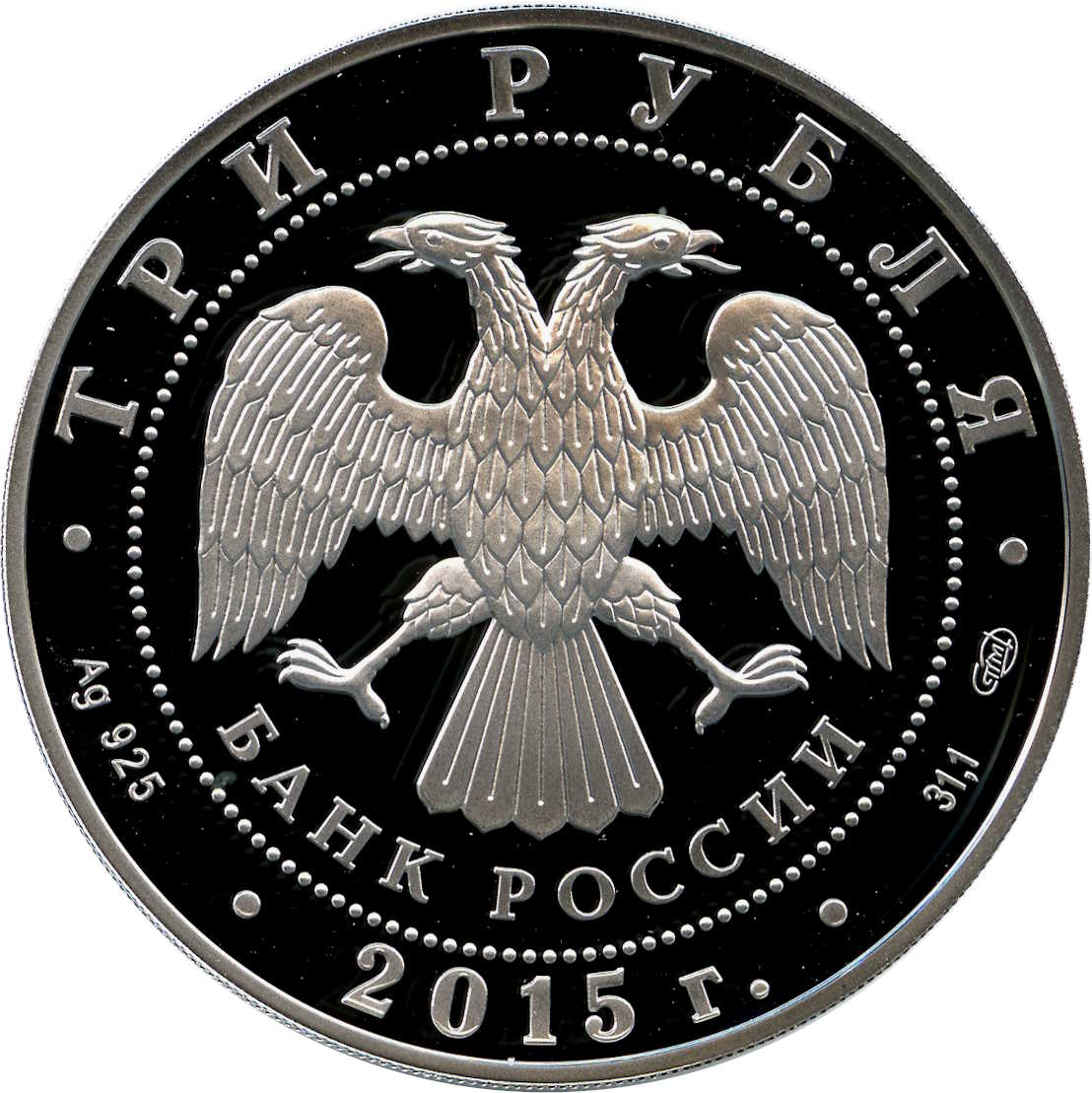 Опис: У центрі — емблема Банку Росії [двоголовий орел із розпростертими крилами, під ним — напівкруглий напис «БАНК РОССИИ» (БАНК РОСІЇ)], обрамлена колом з крапок і написів по краю — зверху: «ТРИ РУБЛЯ», нижче: ліворуч – позначення дорогоцінного металу та його проби, у центрі – рік випуску «2015 г.», праворуч – вміст дорогоцінного металу та знак монетного двору.