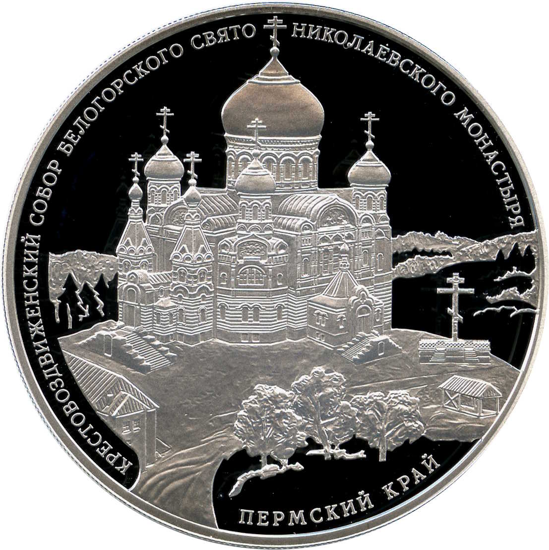 Опис: На дзеркальному полі диска – рельєфне зображення собору, розташованого на височині, праворуч від нього – хрест, на задньому плані – лісиста місцевість, по краю – написи, ліворуч і зверху: «КРЕСТОВОЗДВИЖЕНСКИЙ СОБОР БЕЛОГОРСКОГО СВЯТО – НИКОЛАЕВСКОГО МОНАСТЫРЯ», нижче: «ПЕРМСКИЙ КРАЙ».