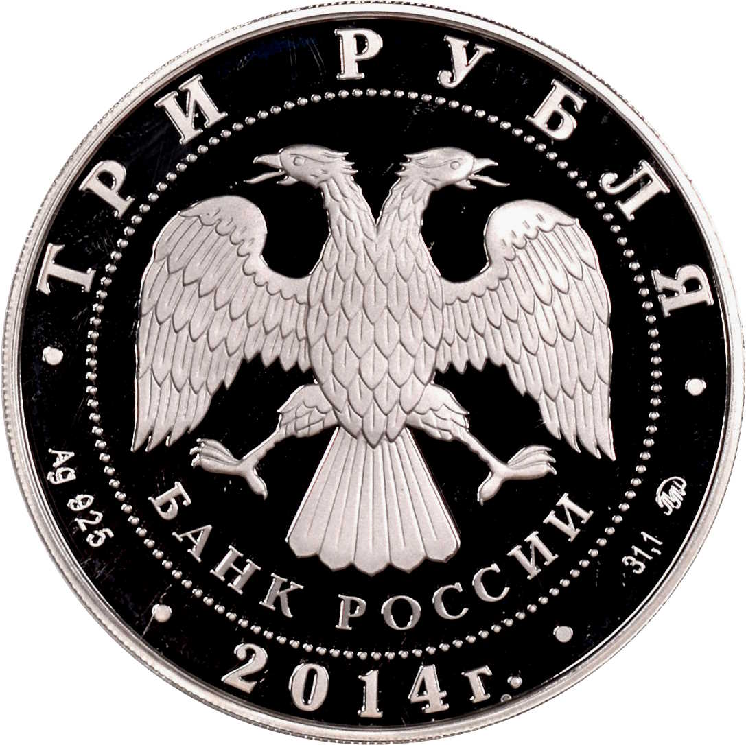 Опис: У центрі — емблема Банку Росії [двоголовий орел із опущеними крилами, під ним — напівкруглий напис «БАНК РОССИИ» (БАНК РОСІЇ)], обрамлена колом з крапок і написів по краю — зверху: «ТРИ РУБЛЯ», нижче: ліворуч – позначення дорогоцінного металу та його проби, у центрі – рік випуску «2014 г.», праворуч – вміст дорогоцінного металу та знак монетного двору.