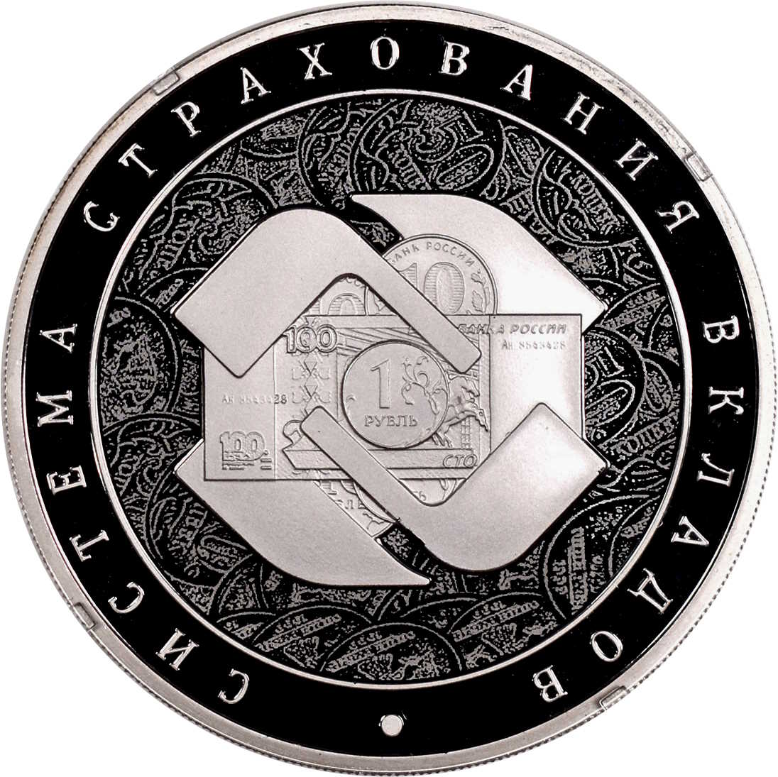 Опис: У центрі диска на тлі розкиданих монет – рельєфні зображення грошових одиниць та елементи логотипу Агентства зі страхування вкладів, по краю – круговий напис: «СИСТЕМА СТРАХОВАНИЯ ВКЛАДОВ» (СИСТЕМА СТРАХУВАННЯ ВКЛАДІВ), розділений знизу крапкою.