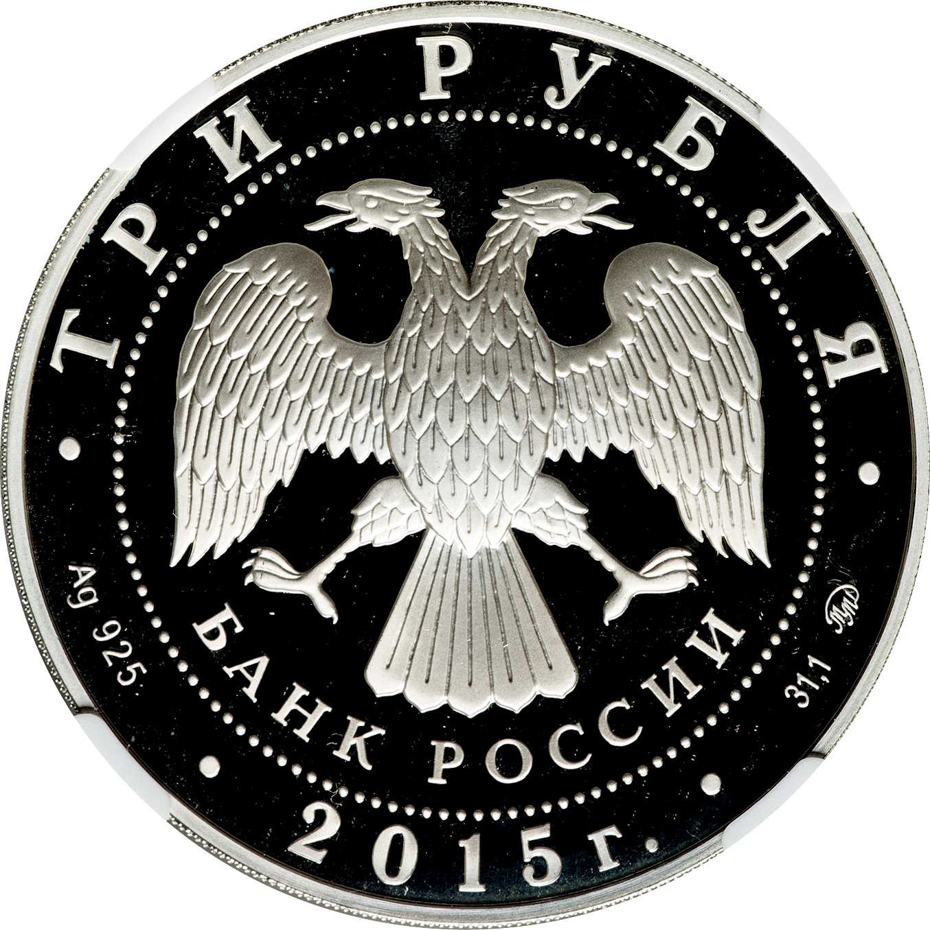 Опис: У центрі — емблема Банку Росії [двоголовий орел із опущеними крилами, під ним — напівкруглий напис «БАНК РОССИИ» (БАНК РОСІЇ)], обрамлена колом з крапок і написів по краю — зверху: «ТРИ РУБЛЯ», нижче: ліворуч – позначення дорогоцінного металу та його проби, у центрі – рік випуску «2015 г.», праворуч – вміст дорогоцінного металу та знак монетного двору.