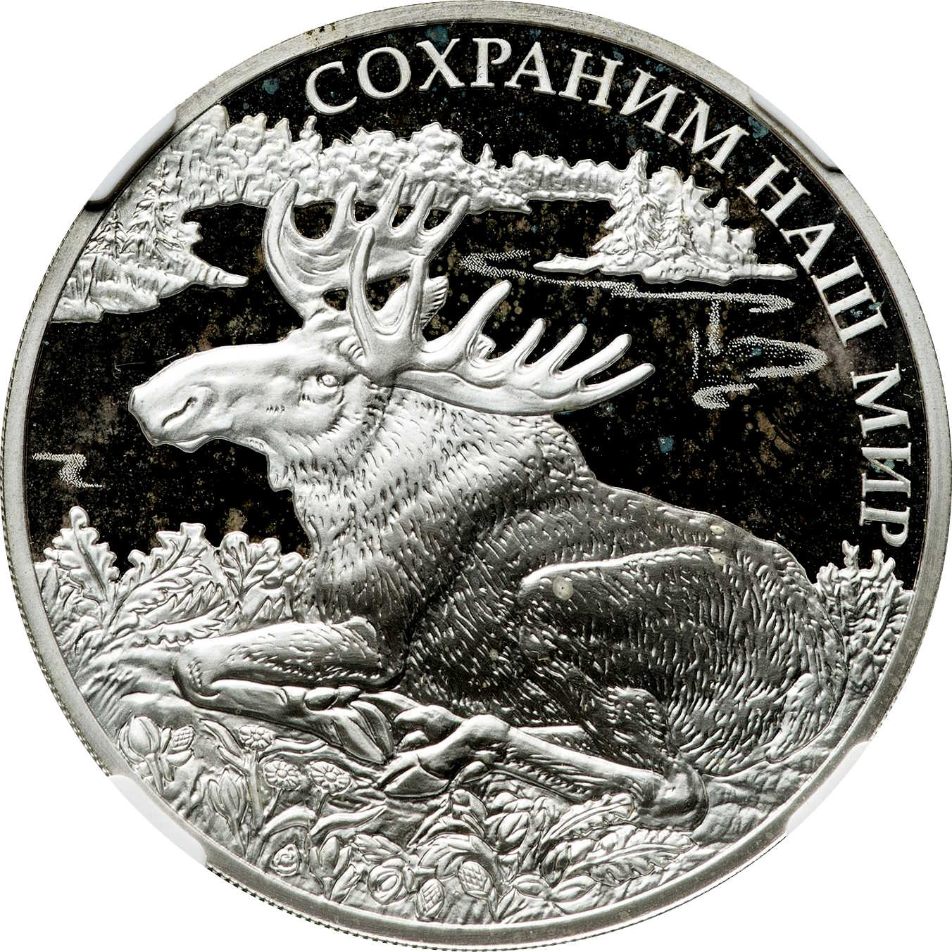 Опис: На дзеркальному полі диска – рельєфне зображення лося, що лежить на березі басейну, вище і праворуч уздовж краю – напис: «СОХРАНИМ НАШ МИР» (ЗБЕРЕЖЕМО НАШ СВІТ).