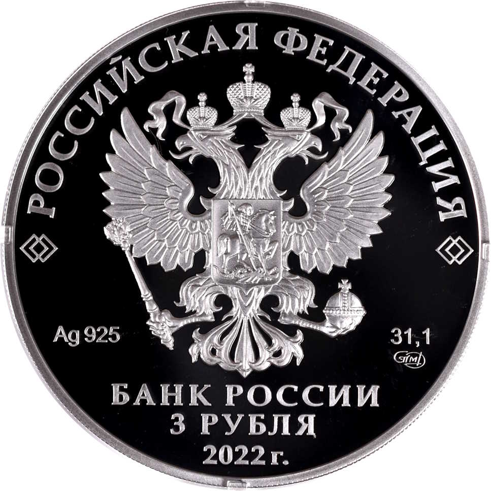 Опис: На аверсі монети зображено рельєфне зображення Державного герба Російської Федерації та написи: «РОССИЙСКАЯ ФЕДЕРАЦИЯ» (РОСІЙСЬКА ФЕДЕРАЦІЯ), «БАНК РОССИИ» (БАНК РОСІЇ), номінал монети: «3 РУБЛЯ», рік випуску «2022 г.», хімічний символ металу за періодичною таблицею Менделєєва, пробу, знак Санкт-Петербурзького монетного двору та вміст дорогоцінного металу.