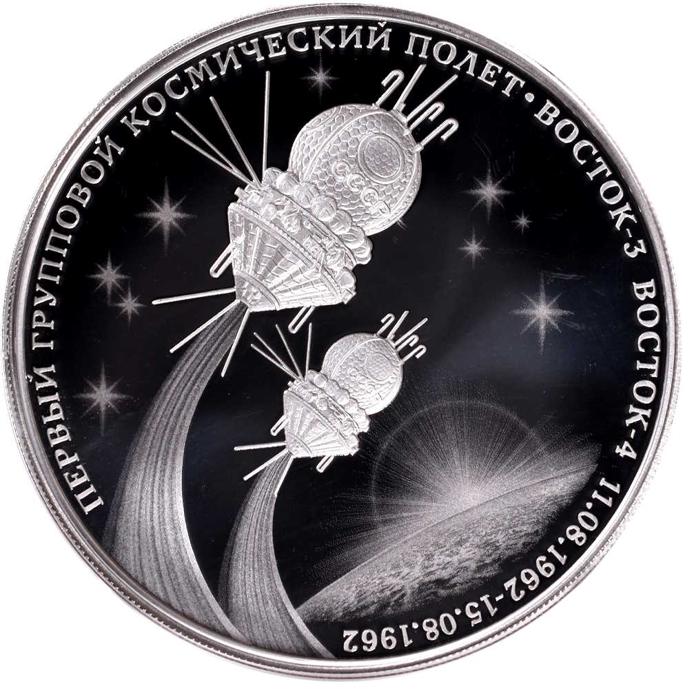 Опис: На зворотному боці монети зображено рельєфні зображення космічного корабля на тлі зображень Землі, сонця, що сходить, і зірок, оброблені лазером для матового покриття; а також рельєфний напис «ПЕРВЫЙ ГРУППОВОЙ КОСМИЧЕСКИЙ ПОЛЕТ • ВОСТОК‑3 ВОСТОК‑4 11.08.1962—15.08.1962» (ПЕРШИЙ ГРУПОВИЙ КОСМІЧНИЙ ПОЛІТ • ВОСТОК‑3 ВОСТОК‑4 11.08.1962–15.08.1962) по колу.