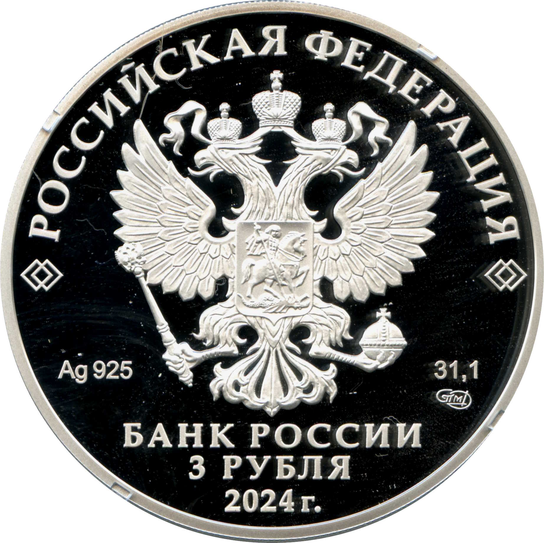 Опис: На дзеркальному полі диска зображено рельєфний герб Російської Федерації, над ним по краю розміщено напівкруглий напис «РОССИЙСКАЯ ФЕДЕРАЦИЯ» (РОСІЙСЬКА ФЕДЕРАЦІЯ), обрамлений з обох боків подвійними ромбами, нижче під гербом зліва вказано дорогоцінний метал і його пробу, а праворуч — вміст дорогоцінного металу та знак монетного двору, внизу по центру трьома рядками розміщено напис «БАНК РОССИИ» (БАНК РОСІЇ), номінал монети «3 РУБЛЯ» (3 РУБЛІ) і рік «2024 г.» (2024).
