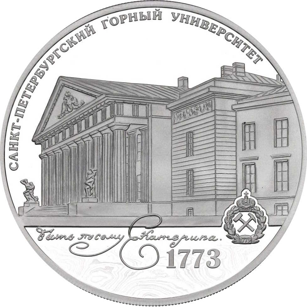 Опис: На зворотному боці монети зображено рельєфне зображення головної будівлі Санкт-Петербурзького гірничого університету; рельєфні зображення цитати з указу Катерини II про заснування університету «Нехай буде прийнято Катериною II», емблема університету та рік його заснування «1773» на тлі декоративного орнаменту, що нагадує природний візерунок на зрізі мінералу, обробленого лазером для матового покриття, внизу; та рельєфний напис «САНКТ-ПЕТЕРБУРГСКИЙ ГОРНЫЙ УНИВЕРСИТЕТ» (САНКТ-ПЕТЕРБУРГСЬКИЙ ГІРНИЧИЙ УНІВЕРСИТЕТ) зліва по колу.