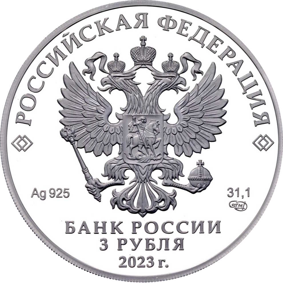 Опис: На аверсі монети зображено рельєфний герб Російської Федерації та написи «РОССИЙСКАЯ ФЕДЕРАЦИЯ» (РОСІЙСЬКА ФЕДЕРАЦІЯ) і «БАНК РОССИИ» (БАНК РОСІЇ), номінал монети «3 РУБЛЯ» (3 РУБЛЯ), рік випуску «2023 г.» (2023), хімічний символ металу за періодичною таблицею Менделєєва, проба, товарний знак Санкт-Петербурзького монетного двору та вміст дорогоцінного металу.