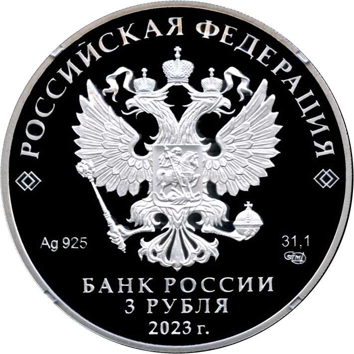 Опис: На аверсі монети зображено рельєфний герб Російської Федерації та написи «РОССИЙСКАЯ ФЕДЕРАЦИЯ» (РОСІЙСЬКА ФЕДЕРАЦІЯ) і «БАНК РОССИИ» (БАНК РОСІЇ), номінал монети «3 РУБЛЯ» (3 РУБЛЯ), рік випуску «2023 г.» (2023), хімічний символ металу за періодичною таблицею Менделєєва, проба, товарний знак Санкт-Петербурзького монетного двору та вміст дорогоцінного металу.
