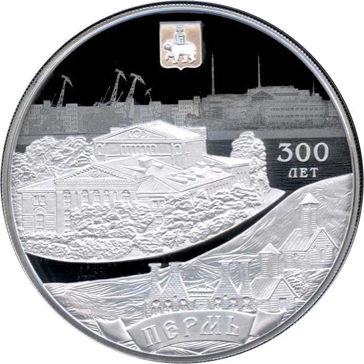 Опис: На зворотному боці монети зображено рельєфні зображення герба Пермі у верхній частині, Пермського театру опери та балету в центрі, старого заводу «Єгошиха» та стрічки з написом «ПЕРМЬ» (ПЕРМ) на тлі зображення річки, докових кранів та промислових об'єктів, оброблених лазером для матового покриття, внизу; а також рельєфний напис «300 ЛЕТ» (300 РОКІВ) у два рядки праворуч.