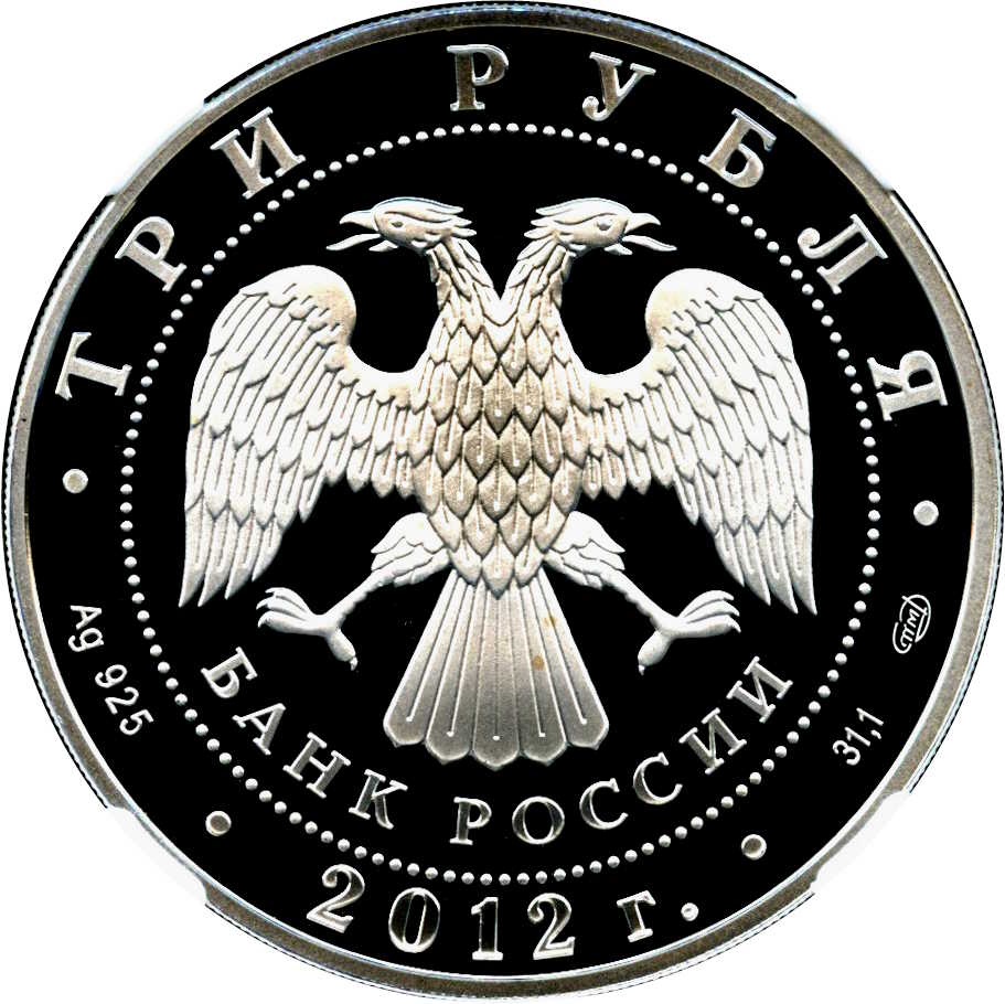 Опис: Зображено рельєфне зображення емблеми Банку Росії — двоголового орла з опущеними крилами та напівкруглий напис під ним «БАНК РОССИИ» (БАНК РОСІЇ), обрамлений колом з бусинками. Написи по колу, розділені крапками, вказують номінал монети «ТРИ РУБЛЯ» (ТРИ РУБЛЯ) і рік випуску «2012», між ними - позначення металу за періодичною системою елементів Д.І. Менделєєва, пробу, клеймо монетного двору і вміст дорогоцінного металу.