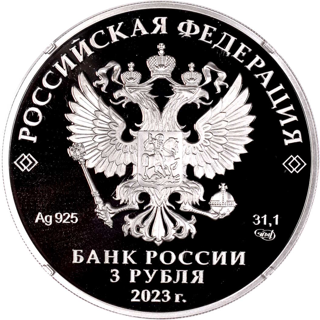 Опис: На аверсі монети зображено рельєфний герб Російської Федерації та написи «РОССИЙСКАЯ ФЕДЕРАЦИЯ» (РОСІЙСЬКА ФЕДЕРАЦІЯ) і «БАНК РОССИИ» (БАНК РОСІЇ), номінал монети «3 РУБЛЯ» (3 РУБЛЯ), рік випуску «2023 г.» (2023), хімічний символ металу за періодичною таблицею Менделєєва, проба, товарний знак Санкт-Петербурзького монетного двору та вміст дорогоцінного металу.
