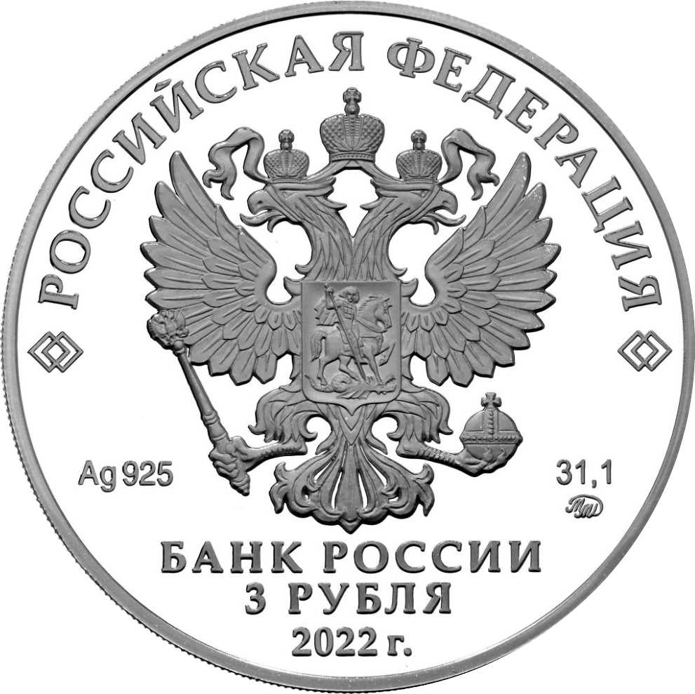 Опис: На аверсі монети зображено рельєфний герб Російської Федерації та написи «РОССИЙСКАЯ ФЕДЕРАЦИЯ» (РОСІЙСЬКА ФЕДЕРАЦІЯ) і «БАНК РОССИИ» (БАНК РОСІЇ), номінал монети «3 РУБЛЯ» (3 РУБЛЯ), рік випуску «2022 г.» (2022), хімічний символ металу за періодичною таблицею Менделєєва, проба, знак Московського монетного двору та вміст дорогоцінного металу.