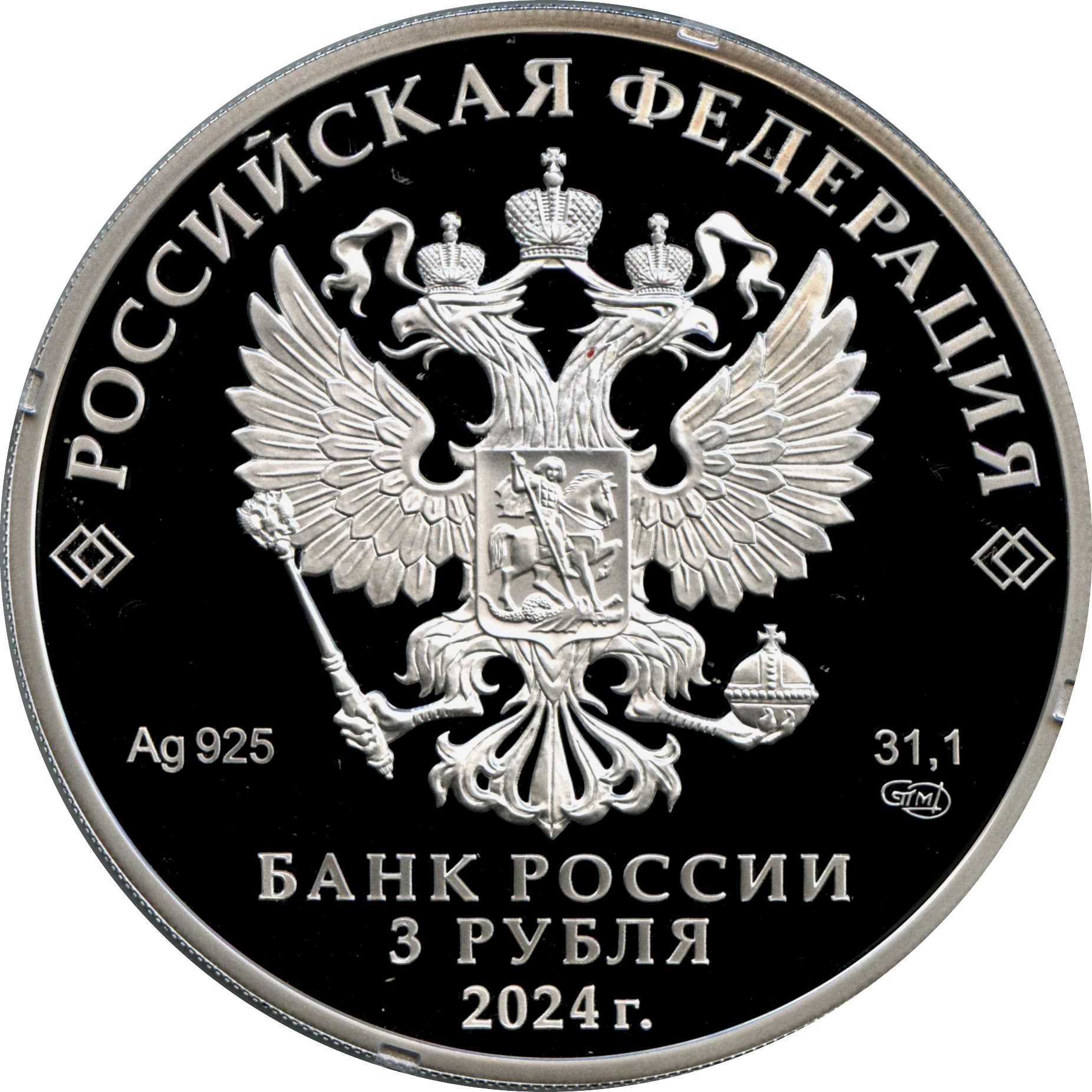 Опис: На аверсі монети зображено рельєфний герб Російської Федерації та написи «РОССИЙСКАЯ ФЕДЕРАЦИЯ» (РОСІЙСЬКА ФЕДЕРАЦІЯ) і «БАНК РОССИИ» (БАНК РОСІЇ), номінал монети «3 РУБЛЯ» (3 РУБЛЯ), рік випуску «2024 г.» (2024), хімічний символ металу за періодичною таблицею Менделєєва, проба, товарний знак Санкт-Петербурзького монетного двору та вміст дорогоцінного металу.