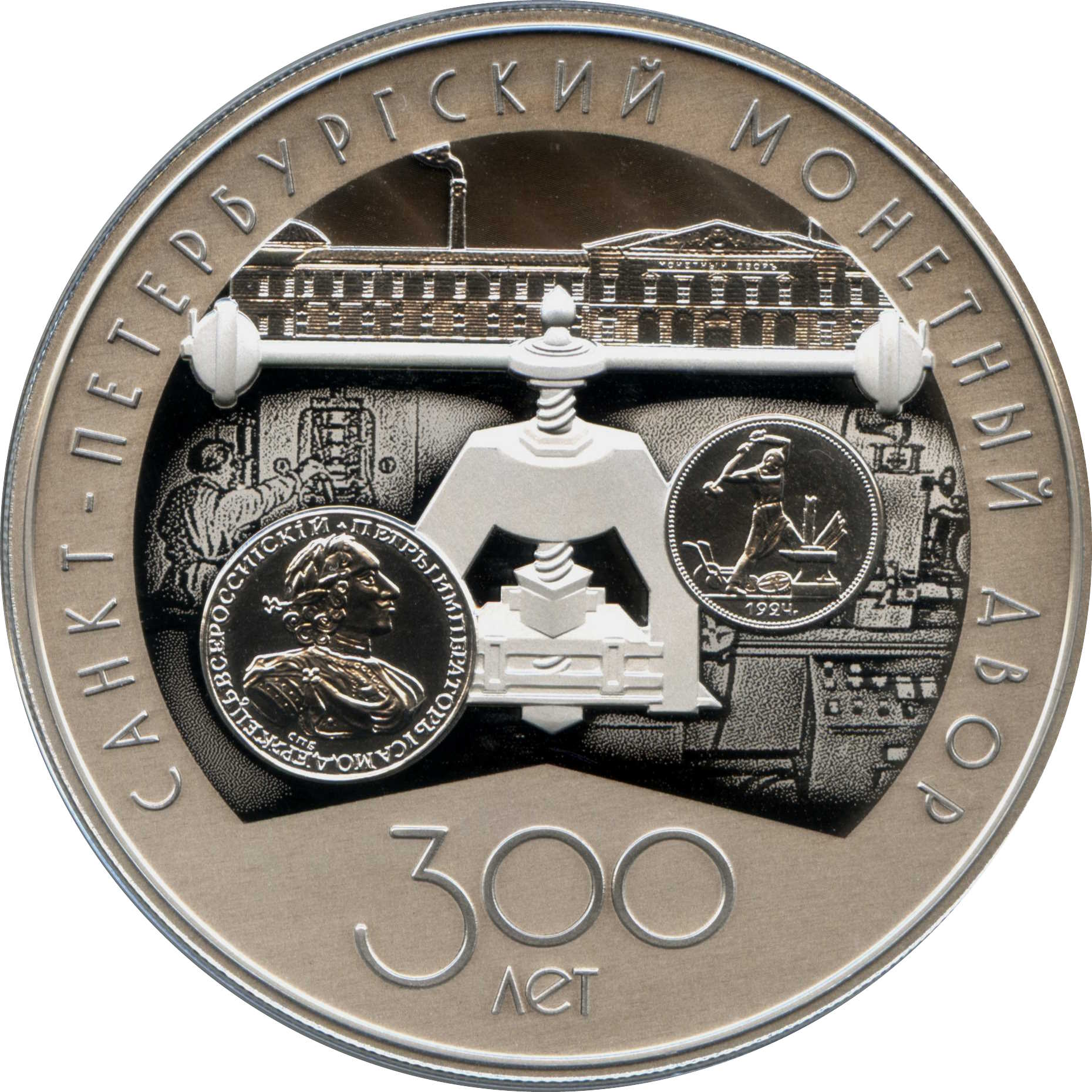 Опис: На реверсі монети зображено рельєфні зображення монетного преса, аверсу рубля 1724 року та реверсу п'ятдесятикопійкової монети 1924 року, зображення будівлі Санкт-Петербурзького монетного двору, обробленого лазером для матового покриття; частини фону навколо преса, обробленого лазером для матового покриття, та фону над зображенням будівлі монетного двору, створеного за допомогою мікрорельєфного візерунка з ефектом світлової інтерференції; рельєфні написи «САНКТ-ПЕТЕРБУРГСКИЙ МОНЕТНЫЙ ДВОР» (САНКТ-ПЕТЕРБУРГСЬКИЙ МОНЕТНИЙ ДВОР) по колу та «300 ЛЕТ» (300 РОКІВ) у два рядки внизу.