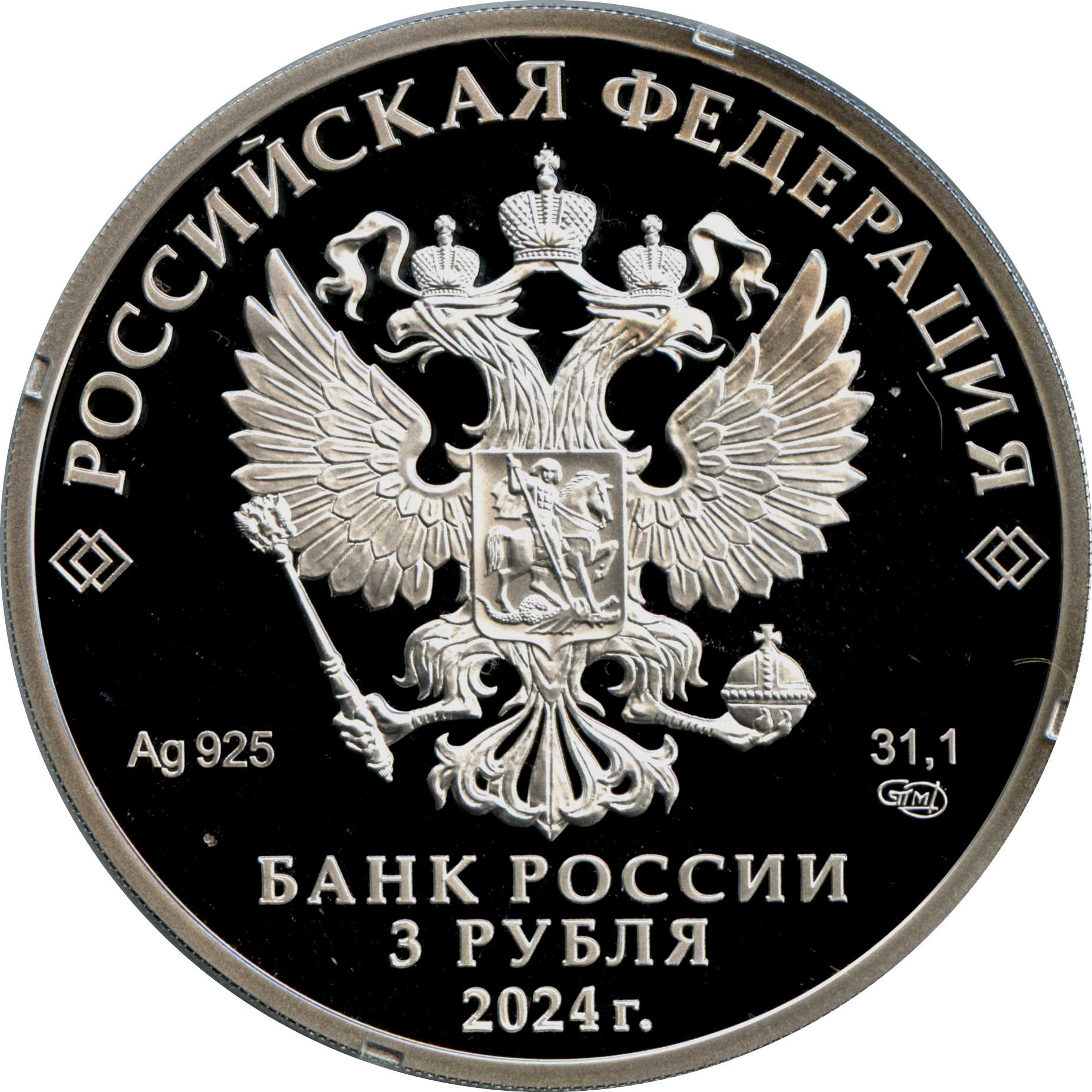 Опис: На аверсі монети зображено рельєфний герб Російської Федерації, над ним по колу напівокругом нанесено напис «РОССИЙСКАЯ ФЕДЕРАЦИЯ» (РОСІЙСЬКА ФЕДЕРАЦІЯ), обрамлений з обох боків парними ромбами, під гербом зліва вказано хімічний символ і пробу металу, а праворуч — вміст дорогоцінного металу та знак монетного двору, у нижній центральній частині трьома рядками розміщено напис «БАНК РОССИИ» (БАНК РОСІЇ), номінал монети «3 РУБЛЯ» (3 РУБЛІ) та рік випуску «2024 г.» (2024).