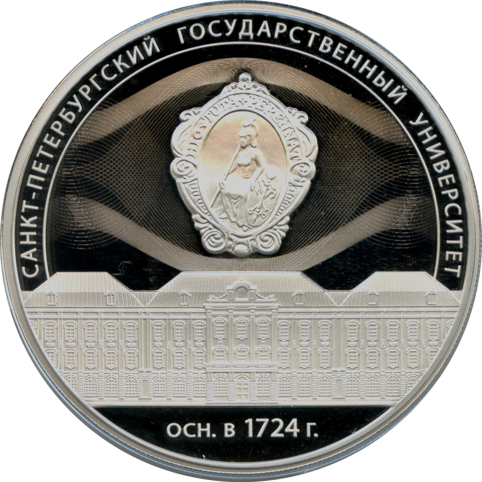 Опис: На зворотному боці монети зображено рельєфні зображення головного корпусу Санкт-Петербурзького державного університету та його символу, обрамленого лінійним візерунком, обробленого лазером для матового покриття; а також рельєфні написи «САНКТ-ПЕТЕРБУРГСКИЙ ГОСУДАРСТВЕННЫЙ УНИВЕРСИТЕТ» (САНКТ-ПЕТЕРБУРГСЬКИЙ ДЕРЖАВНИЙ УНІВЕРСИТЕТ) у верхній частині по колу та «осн. в 1724 г.» (заснований у 1724 р.) у нижній частині.