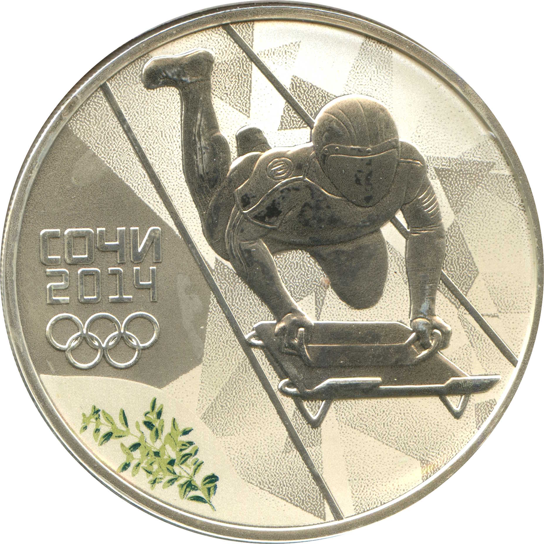 Опис: Фігура скелетоніста, кольорова гілка самшиту, напис «SOCHI 2014», 5 олімпійських кілець.