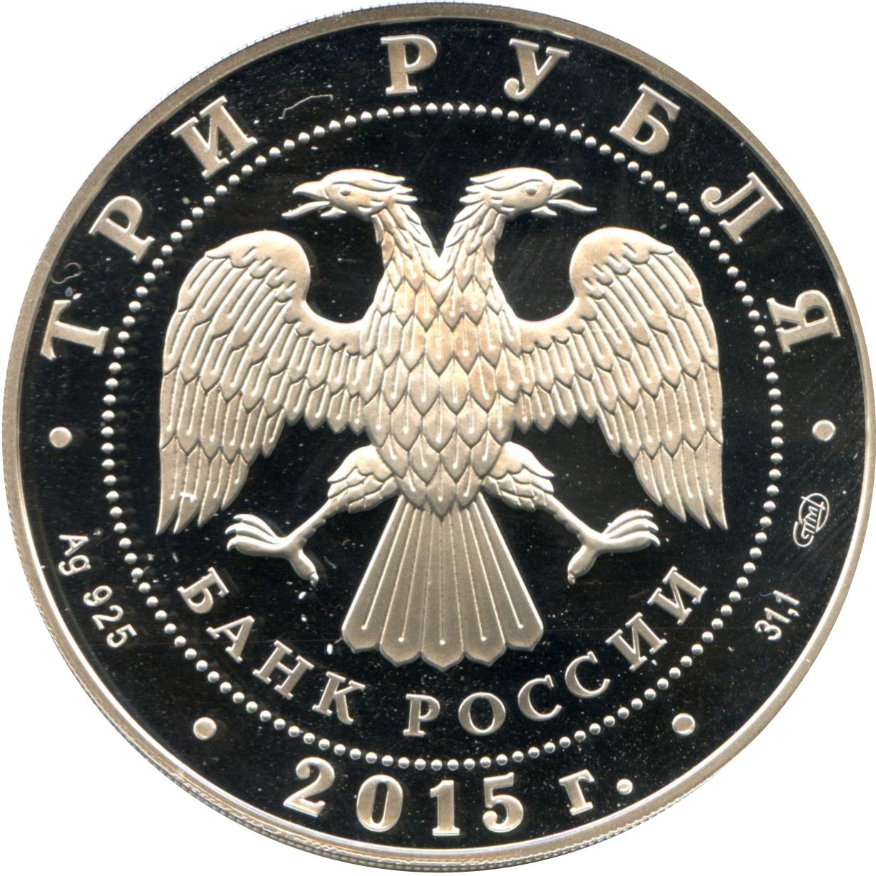 Опис: У центрі — емблема Банку Росії [двоголовий орел із опущеними крилами, під ним — напівкруглий напис «БАНК РОССИИ» (БАНК РОСІЇ)], обрамлена колом з крапок і написів по краю — зверху: «ТРИ РУБЛЯ», нижче: ліворуч – позначення дорогоцінного металу та його проби, у центрі – рік випуску «2015 г.», праворуч – вміст дорогоцінного металу та знак монетного двору.