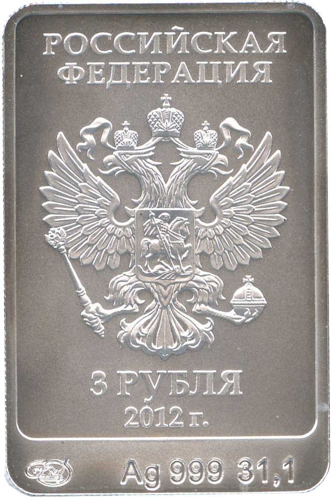 Опис: У центрі — рельєфне зображення державного герба Російської Федерації (двоголовий орел з розпростертими крилами, увінчаний двома маленькими коронами, а над ними — великою, з'єднаною смугою). Орел тримає скіпетр у правій лапі та державу в лівій лапі. На грудях на щиті — лицар у плащі, що сидить на коні та вбиває дракона, поваленого та розтоптаного конем); написи — над гербом у два рядки: «РОССИЙСКАЯ ФЕДЕРАЦИЯ» (РОСІЙСЬКА ФЕДЕРАЦІЯ), під гербом у два рядки - номінал: «3 РУБЛЯ» (3 РУБЛІ) і дата: «2011 г.» (2011), внизу по колу: ліворуч - знак монетного двору, в центрі - позначення дорогоцінного металу та його проби, праворуч - вміст дорогоцінного металу.
