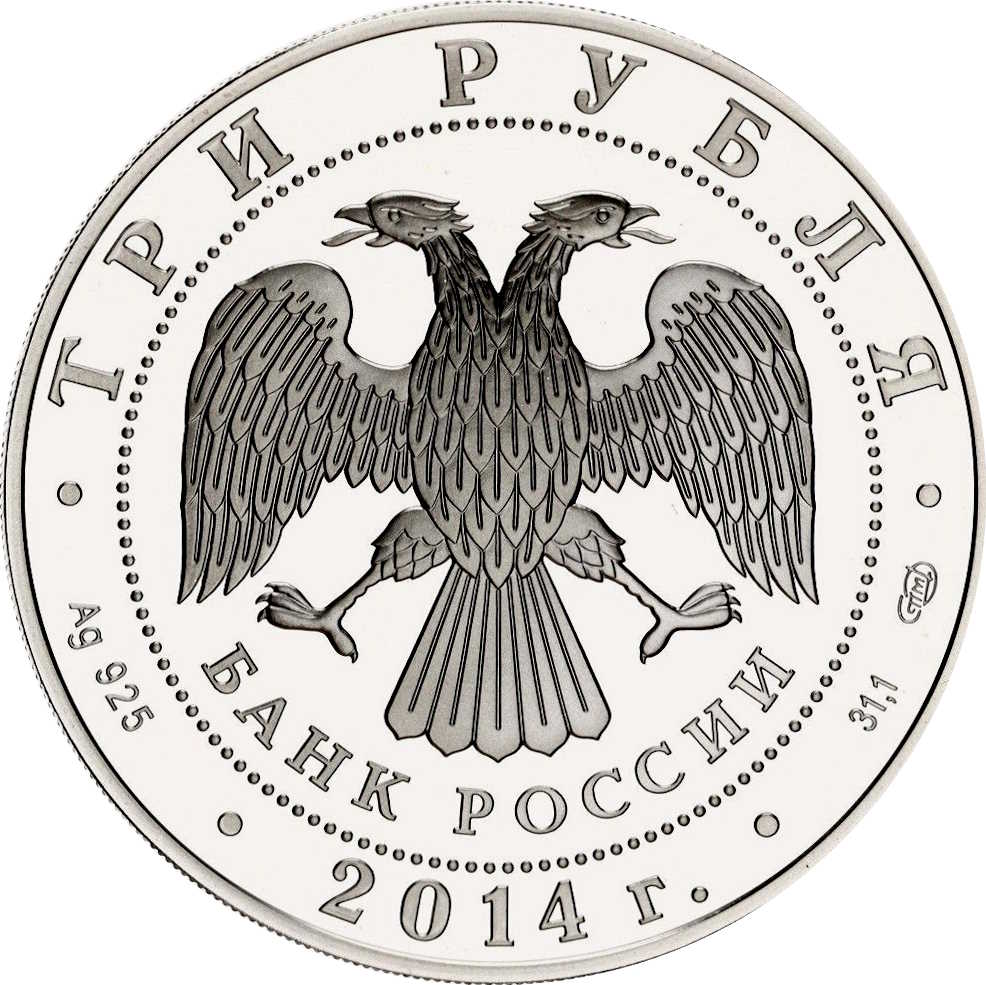 Опис: У центрі — емблема Банку Росії [двоголовий орел із опущеними крилами, під ним — напівкруглий напис «БАНК РОСІЇ»], обрамлена колом з крапок, а по краю — напис: зверху: «ТРИ РУБЛЯ», внизу: ліворуч – позначення дорогоцінного металу та його проби, в центрі – рік випуску «2014 г.», праворуч – вміст дорогоцінного металу та знак монетного двору.