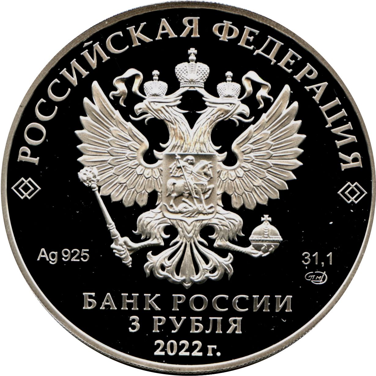 Опис: На дзеркальному полі диска зображено рельєфний герб Російської Федерації, над ним по колу розміщено напівкруглий напис «РОССИЙСКАЯ ФЕДЕРАЦИЯ» (РОСІЙСЬКА ФЕДЕРАЦІЯ), обрамлене з обох боків подвійними ромбами, нижче під гербом зліва вказано дорогоцінний метал і його пробу, а праворуч — вміст дорогоцінного металу і знак монетного двору, внизу по центру трьома рядками розміщено напис «БАНК РОССИИ» (БАНК РОСІЇ), номінал монети «3 РУБЛЯ» (3 РУБЛІ) і рік «2022 г.» (2022).