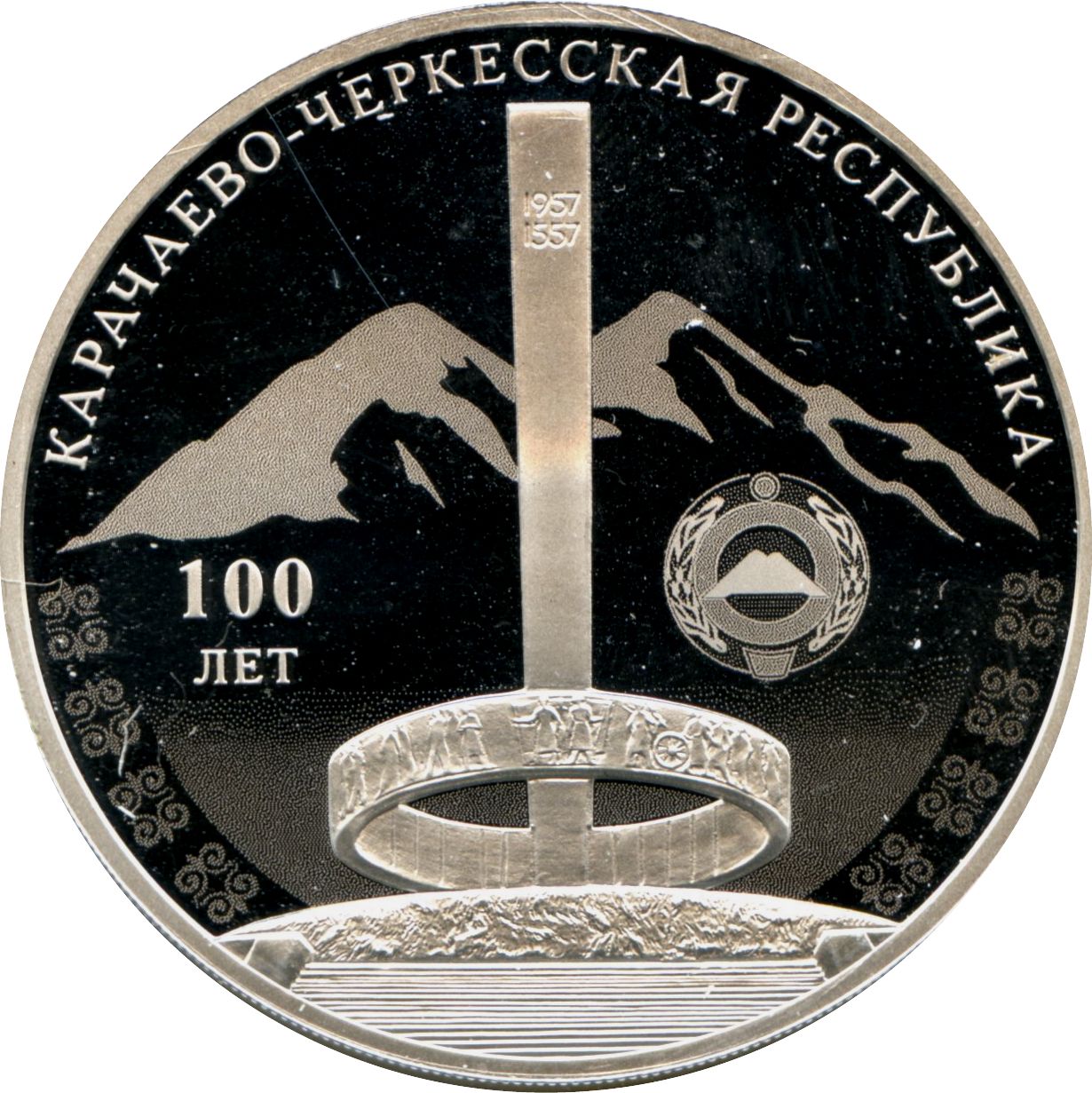 Опис: На дзеркальному полі диска зображено рельєфне зображення стели «Дружба народів Карачаєво-Черкесії» на тлі стилізованого зображення вершин Ельбрусу; праворуч — зображення державного герба Карачаєво-Черкеської Республіки; є написи: «КАРАЧАЕВО-ЧЕРКЕССКАЯ РЕСПУБЛИКА» (КАРАЧАЄВО-ЧЕРКЕССЬКА РЕСПУБЛІКА) вздовж верхнього краю та «100 ЛЕТ» (100 РОКІВ) зліва.