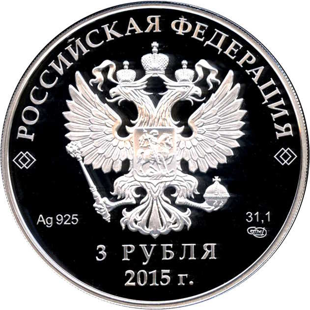 Опис: У центрі — Державний герб Російської Федерації, над ним по колу — напис: «РОССИЙСКАЯ ФЕДЕРАЦИЯ» (РОСІЙСЬКА ФЕДЕРАЦІЯ), нижче під гербом ліворуч – позначення металу та його проби, праворуч – вміст дорогоцінного металу та знак монетного двору, нижче у два рядки – номінал: «3 РУБЛЯ» (3 РУБЛЯ) і рік випуску «2015 г.» (2015).