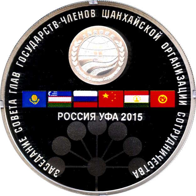 Опис: На дзеркальному полі диска в центрі – кольорові зображення шести національних прапорів держав-членів ШОС, розташовані в горизонтальному ряду, під ними напис: «РОССИЯ УФА 2015» (Росія Уфа 2015), над прапорами – емблема ШОС, нижче – елемент національної символіки Башкортостану – квітка курай, по краю – напис: «ЗАСЕДАНИЕ СОВЕТА ГЛАВ ГОСУДАРСТВ – ЧЛЕНОВ ШАНХАЙСКОЙ ОРГАНИЗАЦИИ СОТРУДНИЧЕСТВА» (Засідання ради глав держав – членів Шанхайської організації співробітництва).