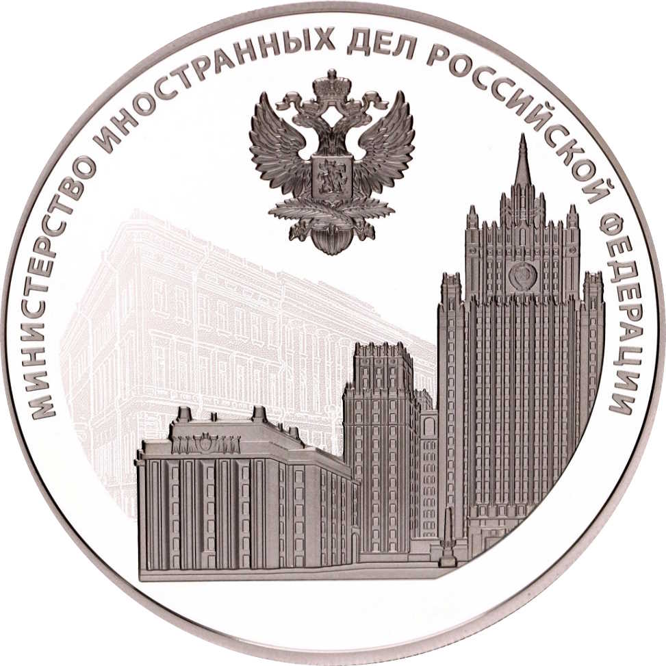 Опис: На дзеркальній поверхні диска зображено рельєфне зображення будівлі Міністерства закордонних справ Російської Федерації, розташованої на Смоленській-Сенній площі в Москві, а також зображення східного крила будівлі Генерального штабу на Палацовій площі в Санкт-Петербурзі, яка до 1917 року служила штаб-квартирою Міністерства закордонних справ Російської імперії; рельєфне зображення емблеми Міністерства закордонних справ Російської Федерації у верхній частині монети; та напис «МИНИСТЕРСТВО ИНОСТРАННЫХ ДЕЛ РОССИЙСКОЙ ФЕДЕРАЦИИ» (МІНІСТЕРСТВО ЗАКОРДОННИХ СПРАВ РОСІЙСЬКОЇ ФЕДЕРАЦІЇ) уздовж верхнього краю.